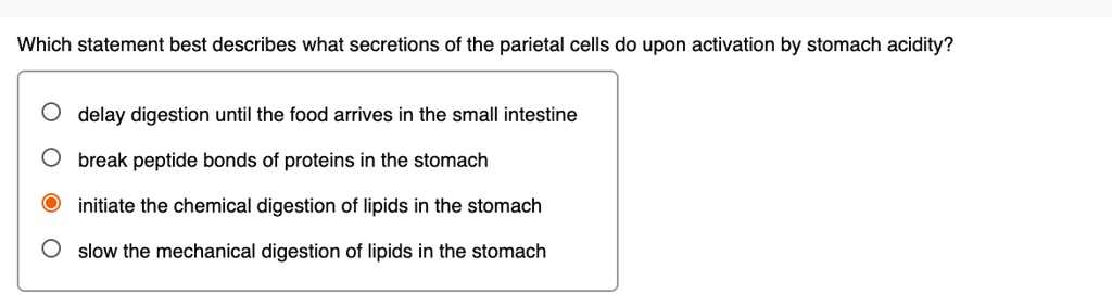 Solved Which Statement Best Describes What Secretions Of The Parietal Cells Do Upon Activation By Stomach Acidity Delay Digestion Until The Food Arrives In The Small Intestine Break Peptide Bonds Of Proteins In